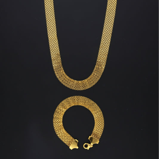 Gold Bold Flat Mesh Chain Set (Chain with Bracelet) 21KT - FKJCNST21KM10388